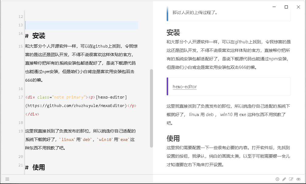 今天要说的就是一款叫做hexo-editor的hexo博客专用markdown编辑器,如果单说功能上,它其实不比其他老牌强者,但是架不住对于Hexo的高度适配,甚至我可以直接在本地预览网页效果,当然,js那些动态是不可能的,但是确实已经是最大化的满足了我的需求,配合图床网页的绑定,本地直接截图粘贴,保存时它帮你上传图片,终于可以告别那讨人厌的上传过程了。