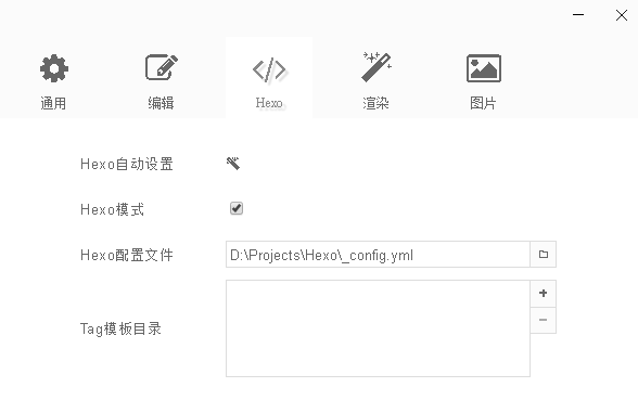 这部分设置很简单,勾选hexo模式,设置hexo配置文件为站点配置文件,就是你根目录下那个,这样子hexo-editor可以通过读取你的配置文件直接完成打开本地服务器预览和提交到github上部署网页。是不是非常方便?