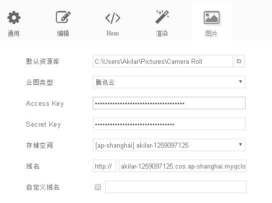 然后找到你的密钥管理,按照指示生成你的密钥。SecretId对应AccessKey,SecretKey对应SecretKey,填入之后下面那些会自动生成的话就是成功了,自定义域名不用去管它。