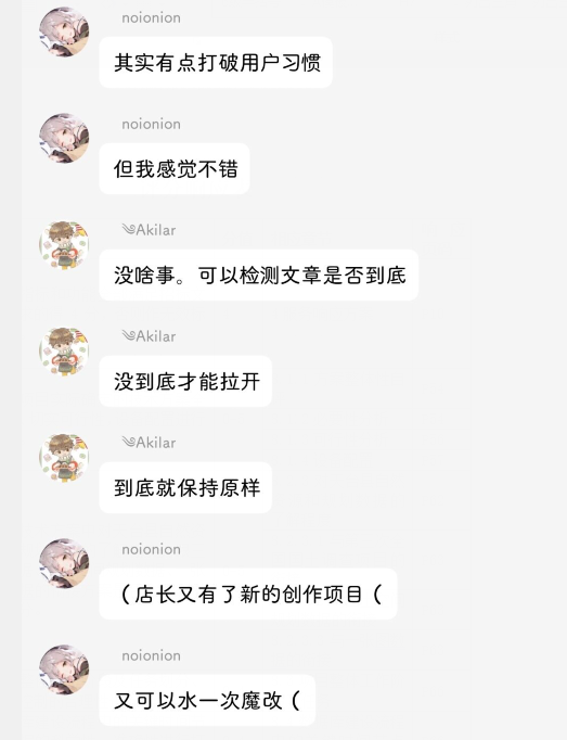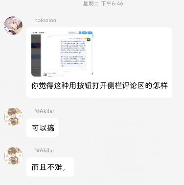 然后呢,肯定又会有讨厌的守旧派说什么不习惯之类的话,所以说众口难调啊众口难调。但是没关系,只要考虑一下业务逻辑就可以了。让评论区默认保持传统的底部挂载模式,同时提供侧栏按钮,让读者自己选择是否选用侧栏评论。
