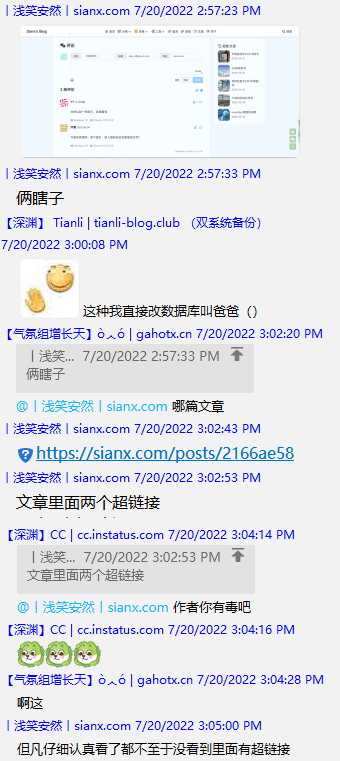 然后是事情的经过,在2022年8月9日,浅笑安然 | sianx.com 又一次在群内发布消息,内容同样是吐槽这两条匿名评论是瞎子,看不到他贴的超链接。
