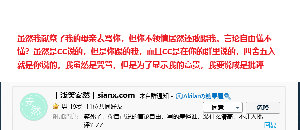 “昨天不是还说什么言论自由”,聊天记录里显示言论自由是CC发的,并且下半句就是“你封禁也是你的自由”,断章取义玩的老顺了。然后呢,我什么时候说过言论自由,糖果屋十条群规第一条就谈不上言论自由了。当然硬要说我自己就违反群规骂他的话我也没话说,求锤得锤嘛。